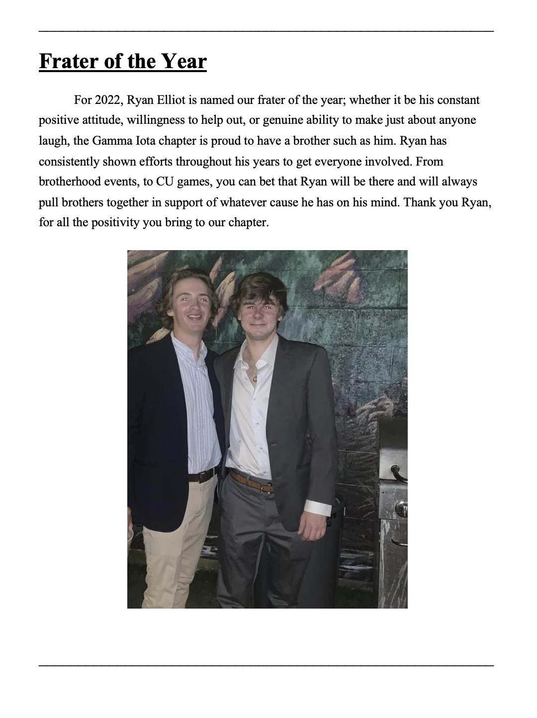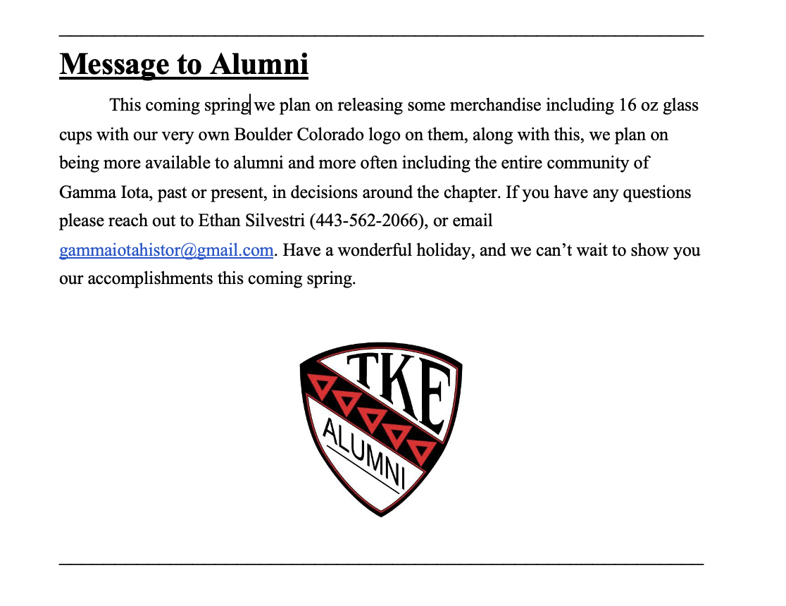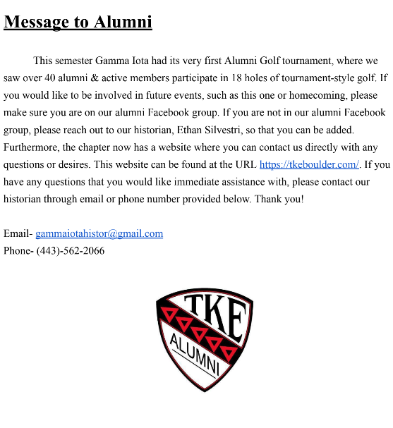 If you are an alum of the Gamma Iota chapter of Tau Kappa Epsilon, please list your information here. Our current historian will reach out to you shortly to assure that you are added to our alumni roster and kept up to date with the current events of our chapter. Thank you for supporting us after your years here, we cannot appreciate you enough.